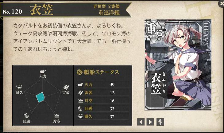 | 自己紹介 | はーい 衣笠さんの登場よ 青葉ともども よろしくね! | 青葉型二番艦である |